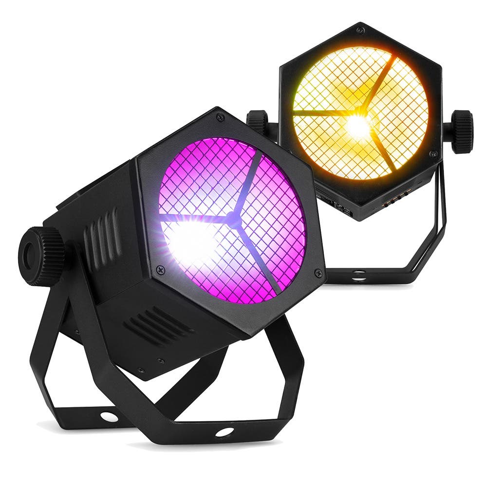Elke retro LED par is uitgerust met een 40W COB LED met RGBW kleurmenging. Je combineert rood, groen, blauw en wit tot een breed scala aan kleuren, van diepe tinten tot zachte pastels. Met deze LED par set wissel je eenvoudig tussen rustige sfeerverlichting en opvallende lichteffecten.