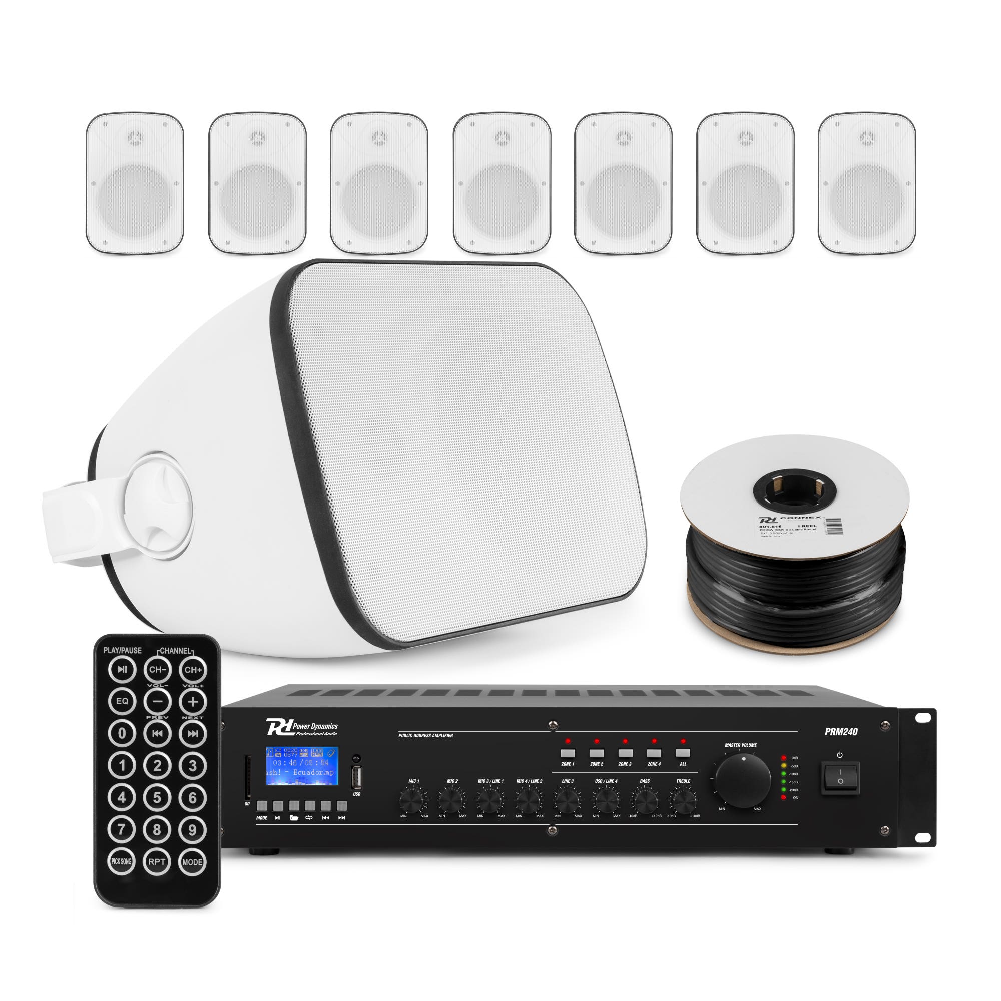 De Power Dynamics PRM240 versterker vormt het hart van deze professionele geluidsinstallatie en stuurt alle speakers eenvoudig aan. Met een vermogen van 240W en 4 zones verdeel je deze geluidsinstallatie over meerdere ruimtes. Je streamt muziek via Bluetooth of speelt af via USB en SD kaart. Daarnaast sluit je eenvoudig meerdere audiobronnen en microfoons aan zodat deze audio installatie geschikt is voor muziek en omroep.